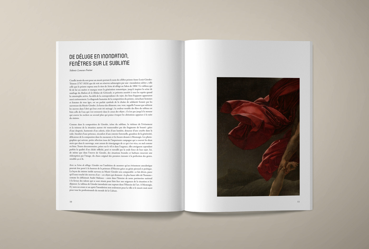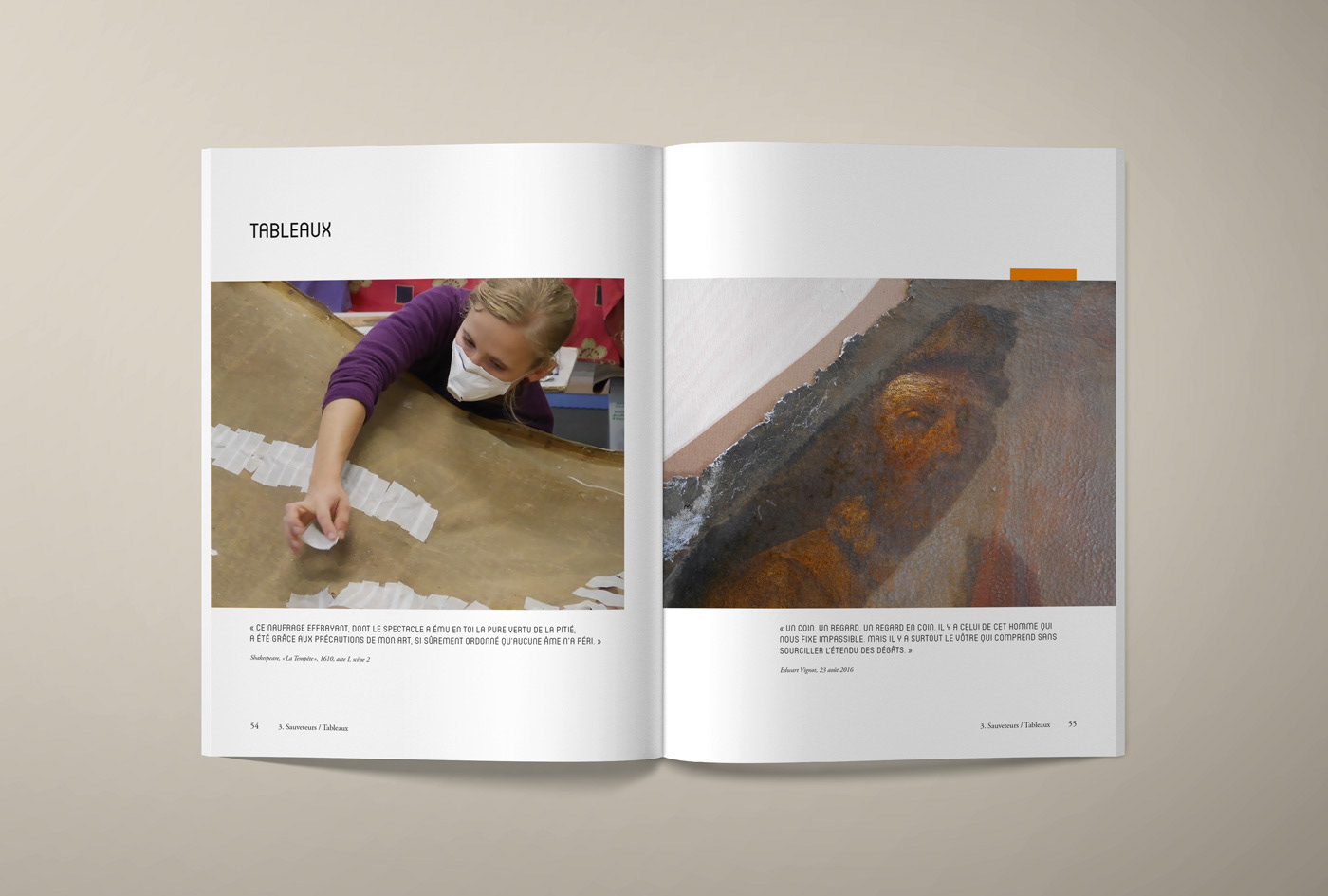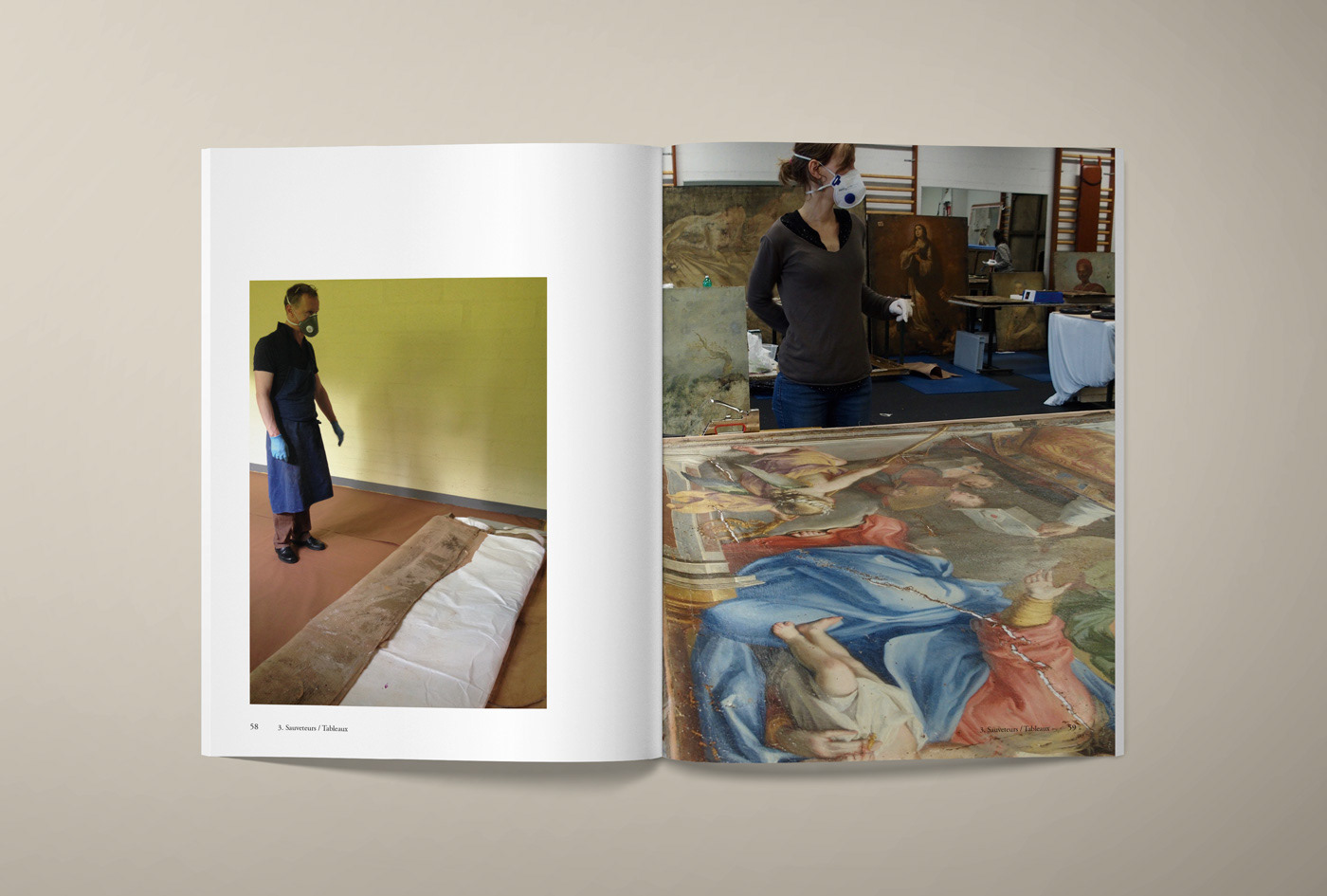 Mise en page du livre “Après le déluge” relatant le sauvetage des œuvres suite aux inondations de 2016.