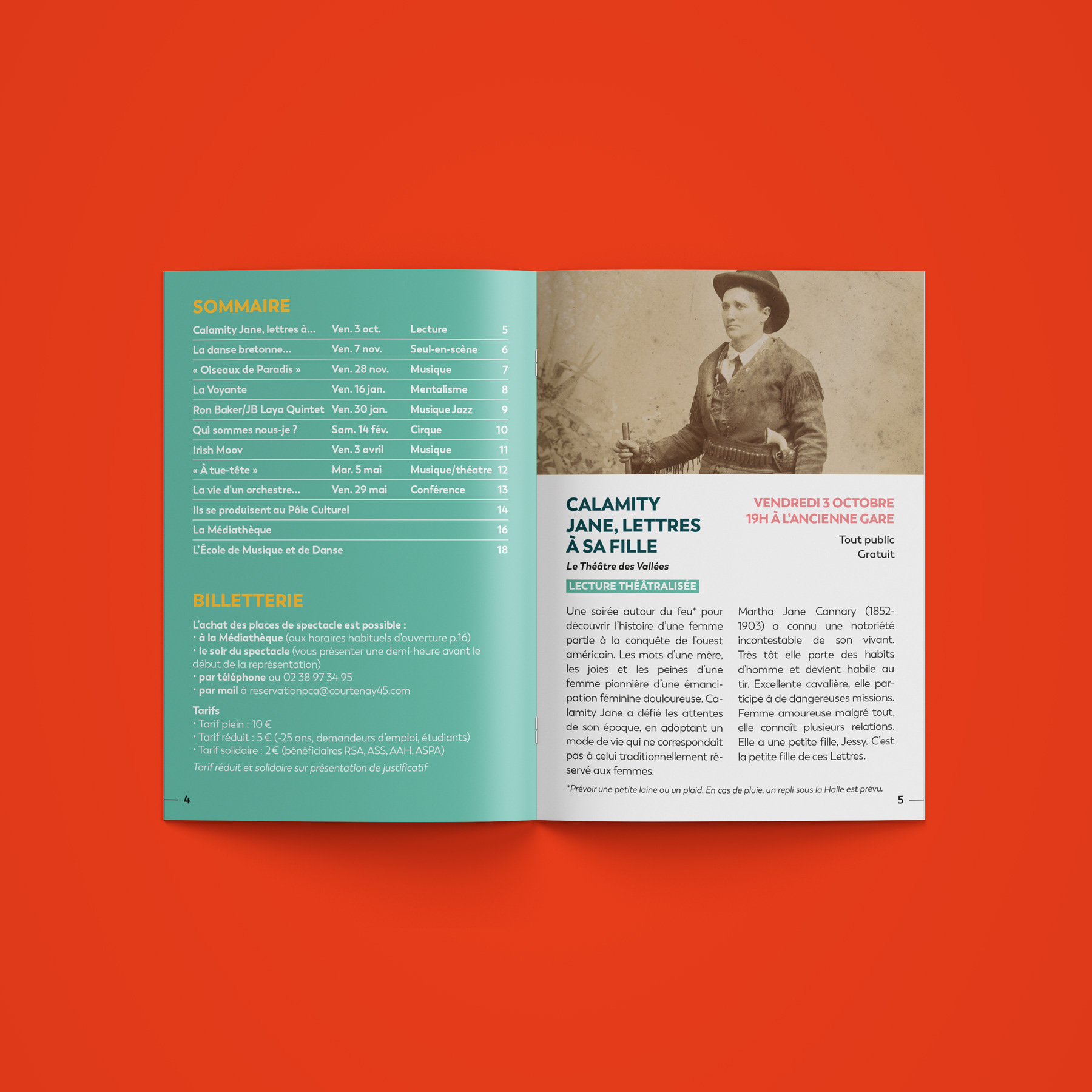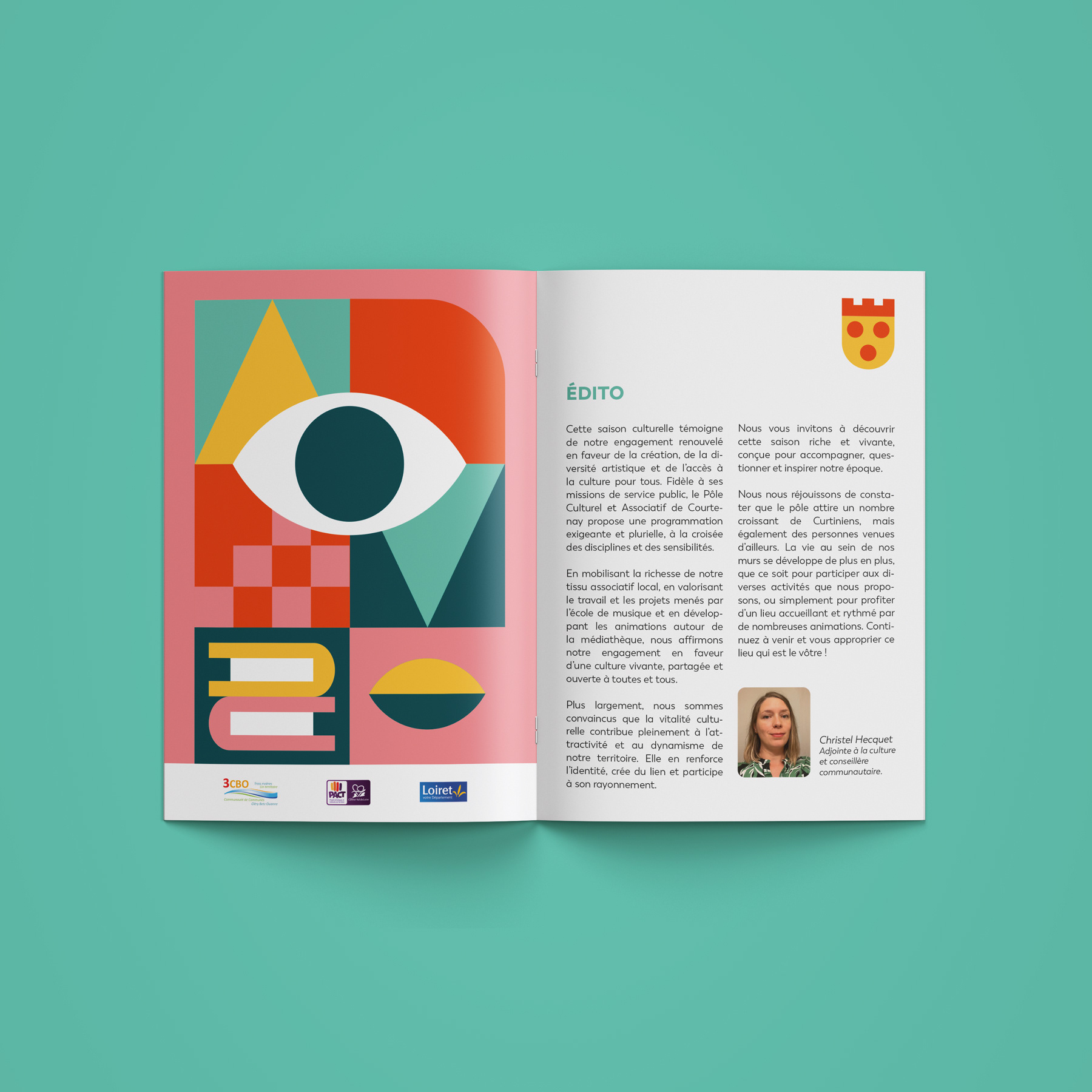 Nouvelle déclinaison graphique pour la saison 2025-26 du Pôle Culturel et Associatif de Courtenay. Réalisation de l"ensemble des supports de communication.