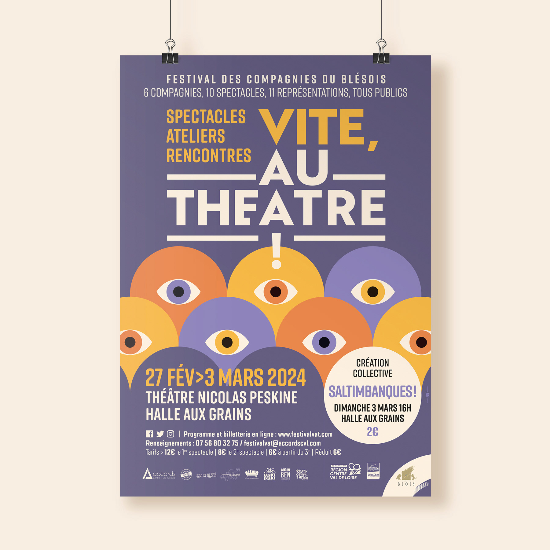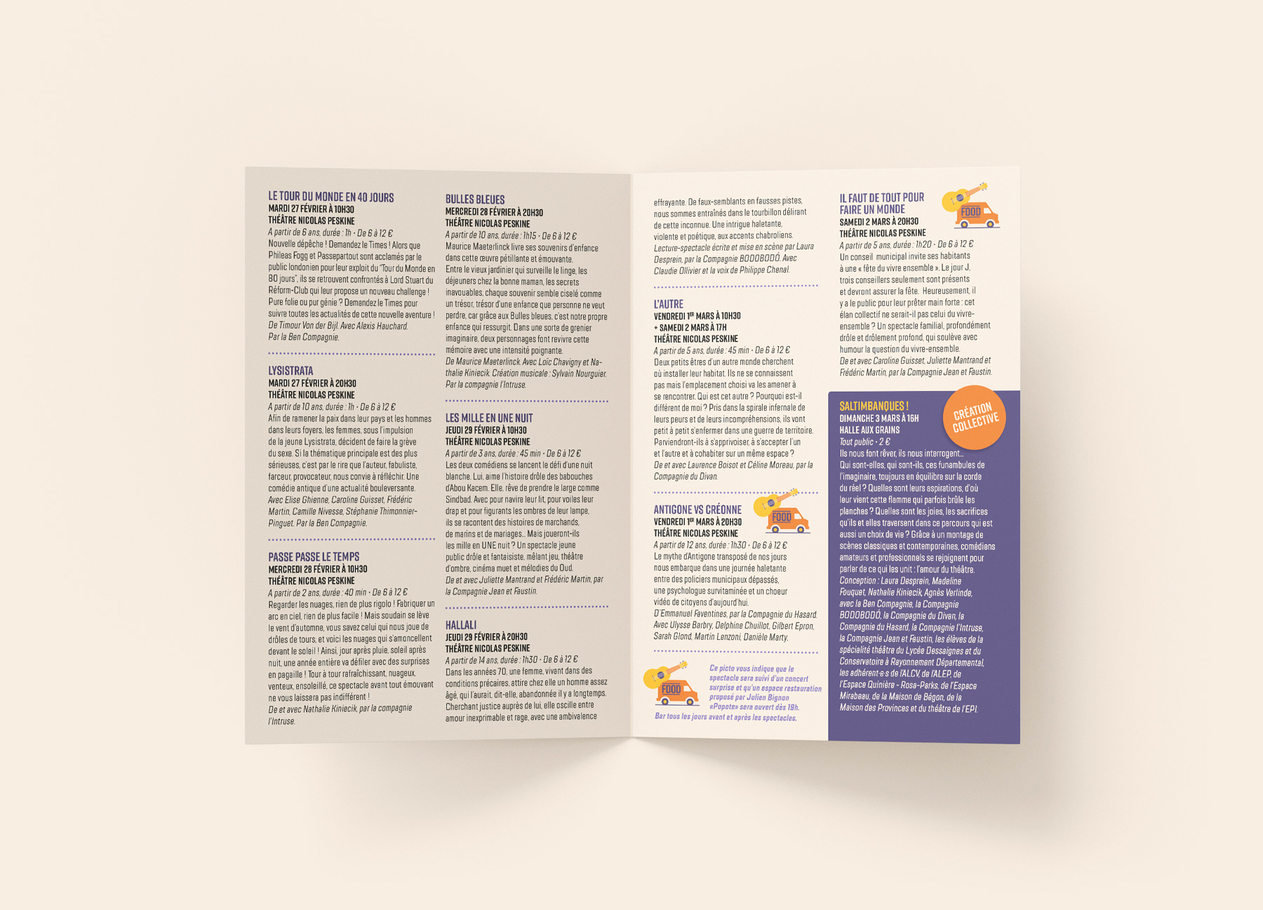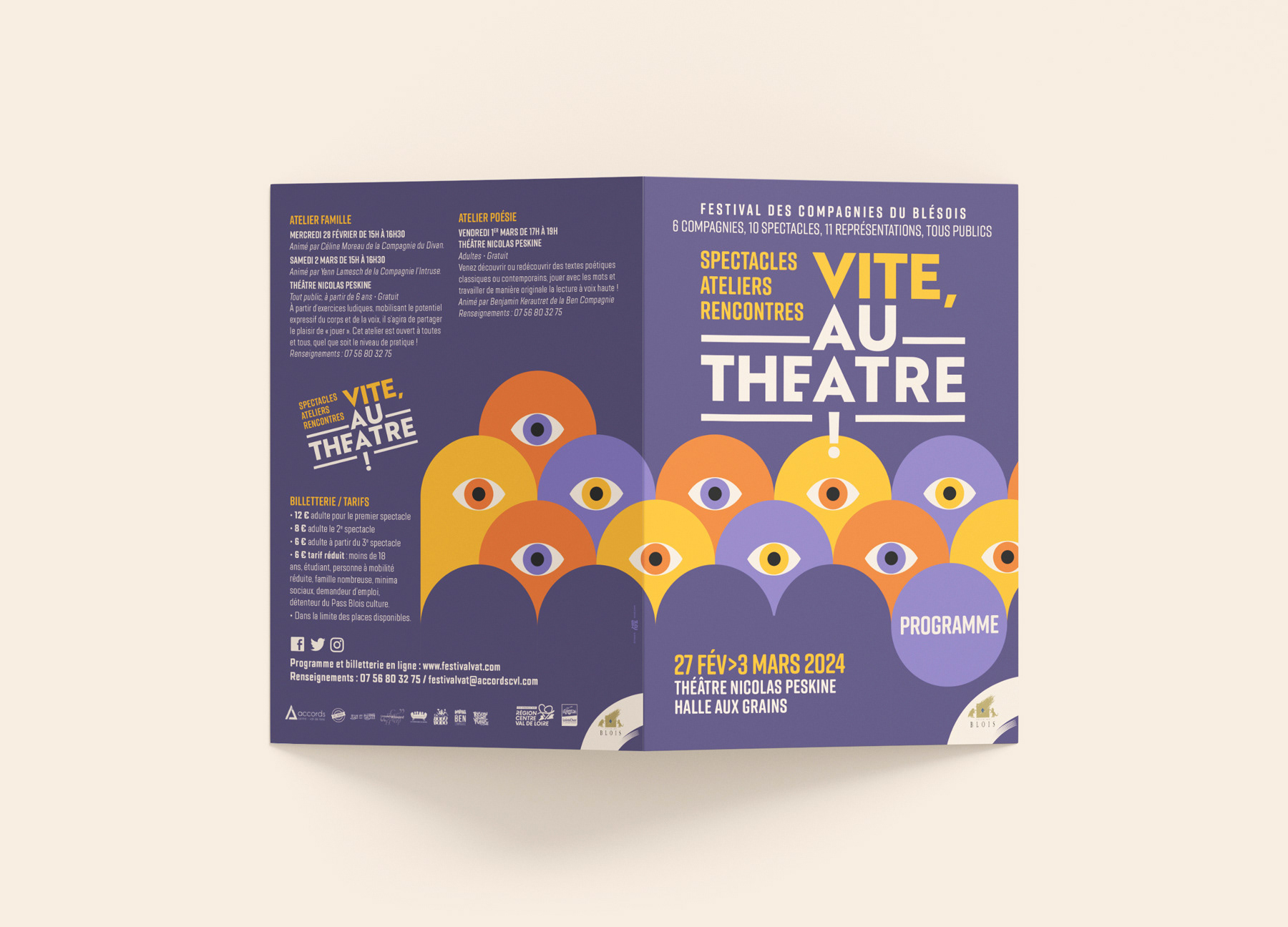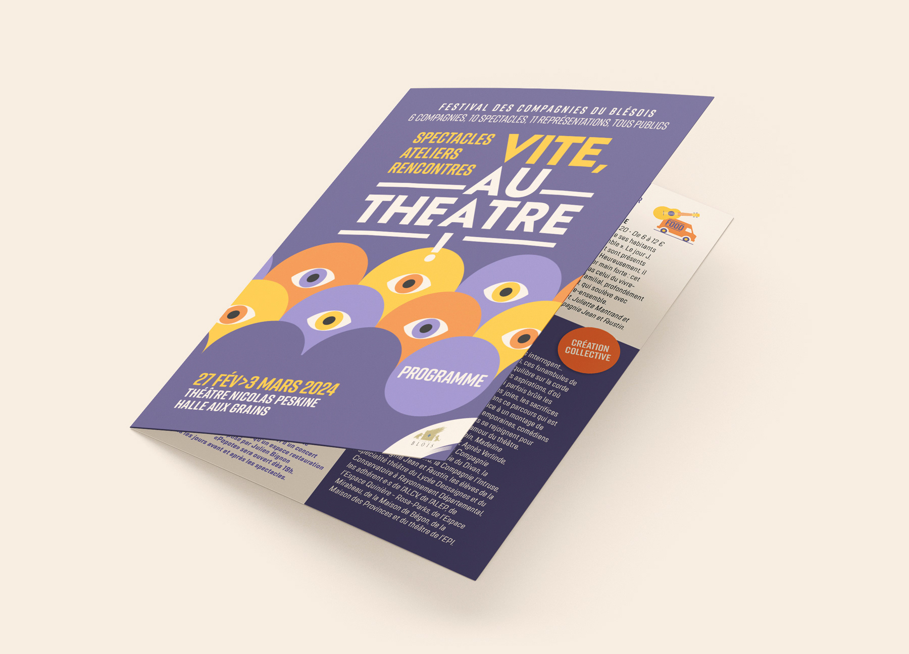 Identité visuelle du festival “Vite, au théâtre !” et réalisation des supports papiers et numériques. Mise en page du programme.